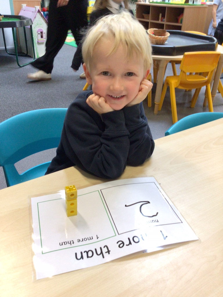 In maths, we’ve been exploring the language of ‘more’ and ‘less’. The children have been comparing groups of objects and practising finding one more than a given number. Merlin Class did a great job at using appropriate mathematical language to describe what they noticed.